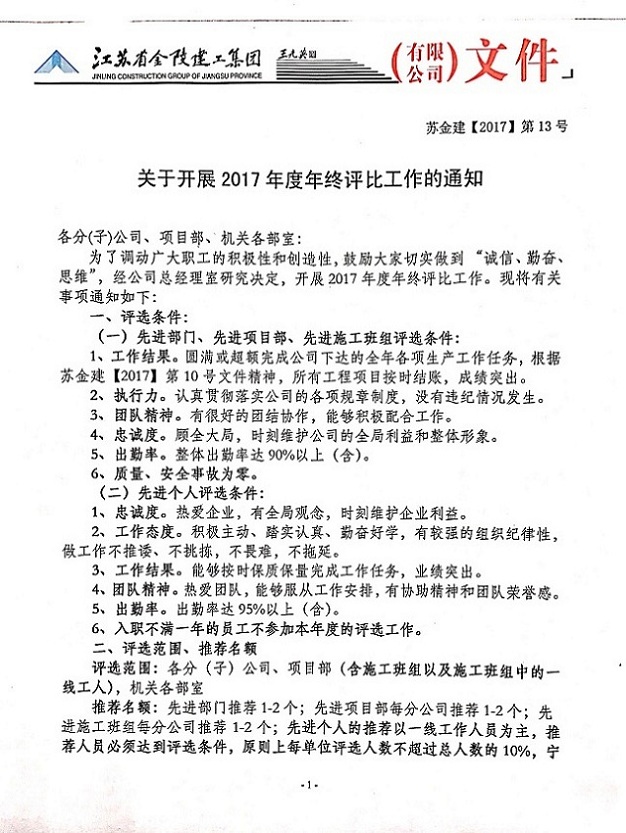 關(guān)于開展2017年度年終評比工作的通知