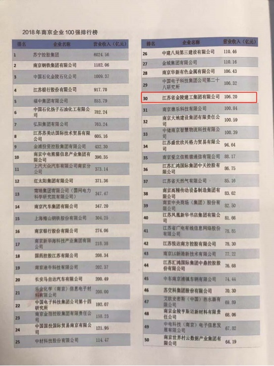 2019年12月20日,南京市企業(yè)聯(lián)合會(huì)、南京市企業(yè)家協(xié)會(huì)公布“2018年南京市企業(yè)100強(qiáng)”榜單,集團(tuán)公司入選榜單,位居第30名。