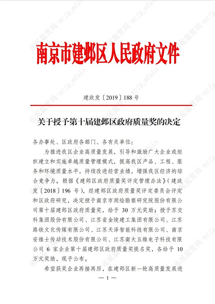 集團(tuán)公司榮獲第十屆建鄴區(qū)政府質(zhì)量獎(jiǎng)提名獎(jiǎng)
